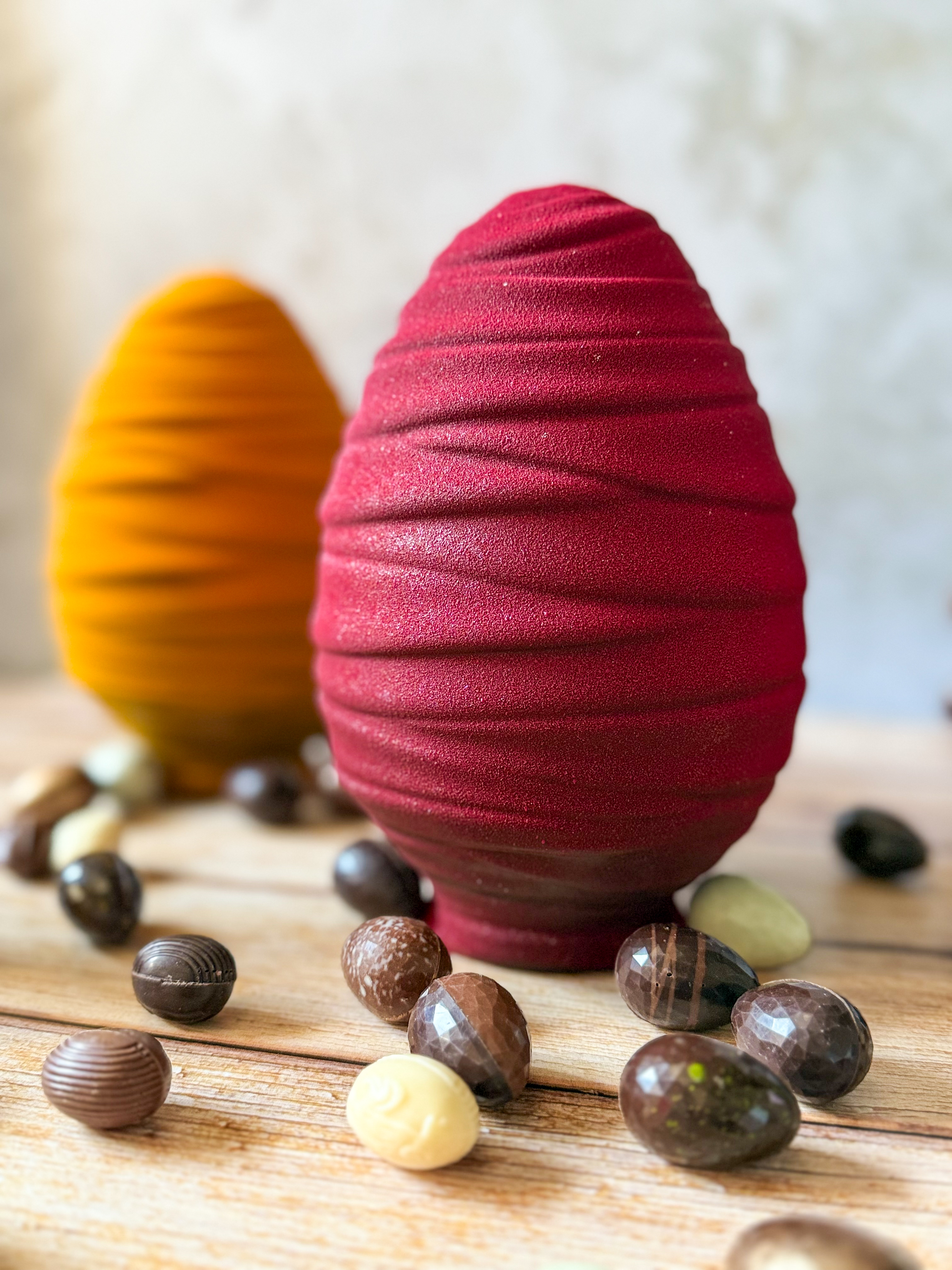 Description : Grand œuf coloré aux courbes arrondies, disponible en chocolat lait ou noir accompagné de ses petits œufs pleins et fourrés mix.